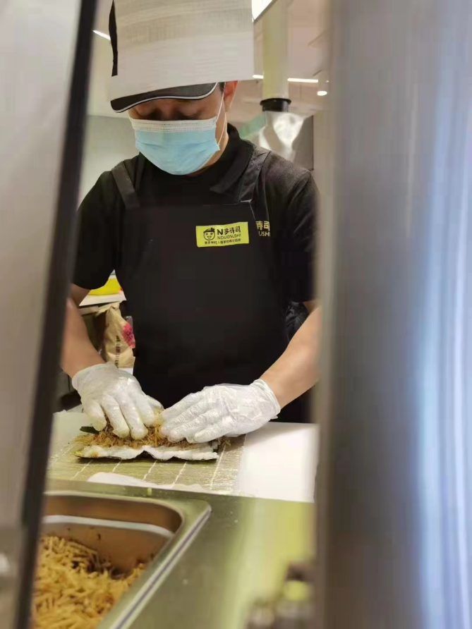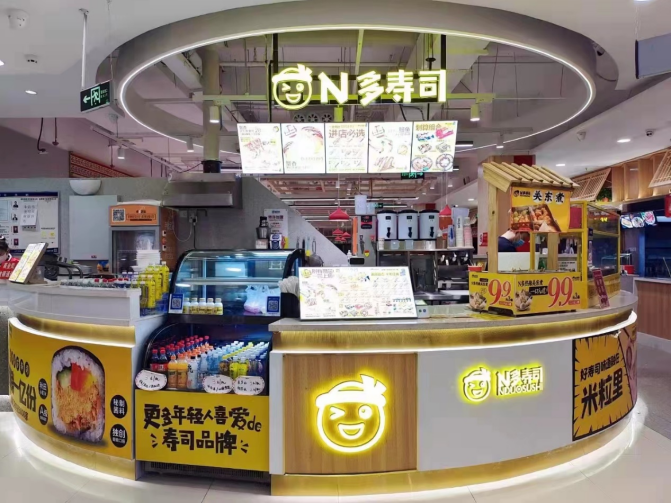 圆弧形的吧台,亮黄色的灯光,加上俏皮可爱的N多头像,店铺一开业,就成了整个商场里最靓丽的风景!更高兴的是,在整个美食城十几个快餐里,开业几个月的时间,销售额一直位居前列!公司产品除了有多种现做寿司,还有关东煮和各种小吃。原料都是公司统一配送,制作方法简单,出餐非常方便快捷,每天除了餐点,其他时间也是客源不断。