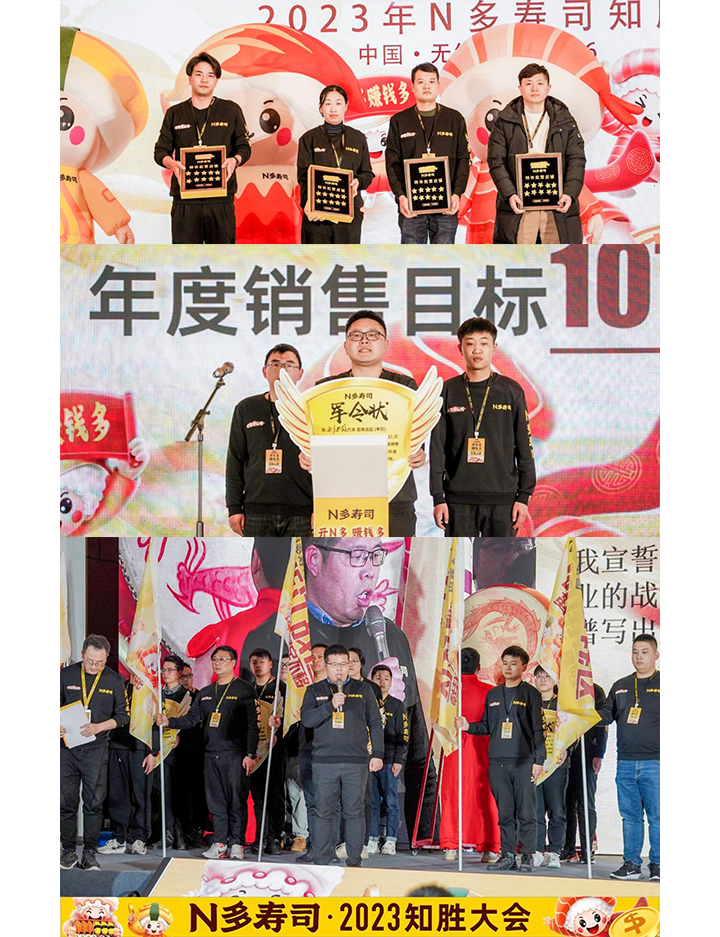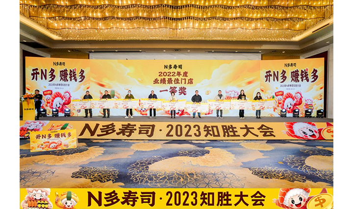 会议上,为N多寿司加盟商、代理商及供应链合作伙伴们举办了颁奖大会。颁发了2022年度累计N多寿司店数量最多奖、2022年度N多寿司店业绩最好门店奖和优秀合作伙伴奖,颁发奖金共计千万!